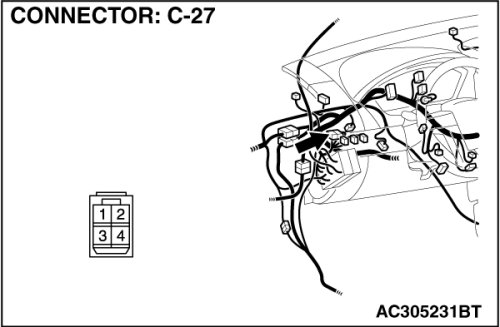 Also check intermediate connector C-27 and joint connector C-03 for loose, corroded, or damaged terminals, or terminals pushed back in the connector. If intermediate connector C-27 or joint connector C-03 is damaged, repair or replace the damaged component(s) as described in Harness Connector Inspection Harness Connector Inspection.