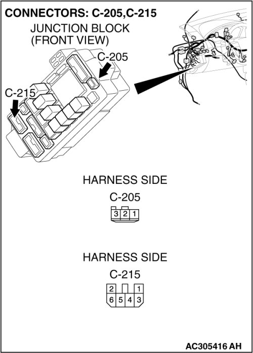 Also check junction block connectors C-215 and C-205 for loose, corroded, or damaged terminals, or terminals pushed back in the connector. If junction block connector C-215 or C-205 is damaged, repair or replace the damaged component(s) as described in Harness Connector Inspection Harness Connector Inspection.