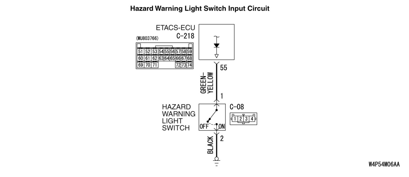 STEP 6. Check the wiring harness between hazard warning light switch connector C-08 (terminal 1) and ETACS-ECU connector C-218 (terminal 55).