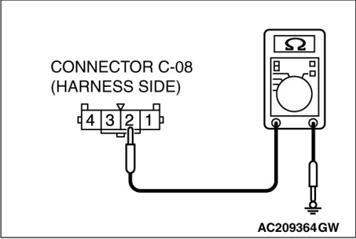 (1)Disconnect hazard warning light switch connector C-08 and measure the resistance available at the wiring harness side of the connector.