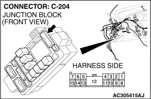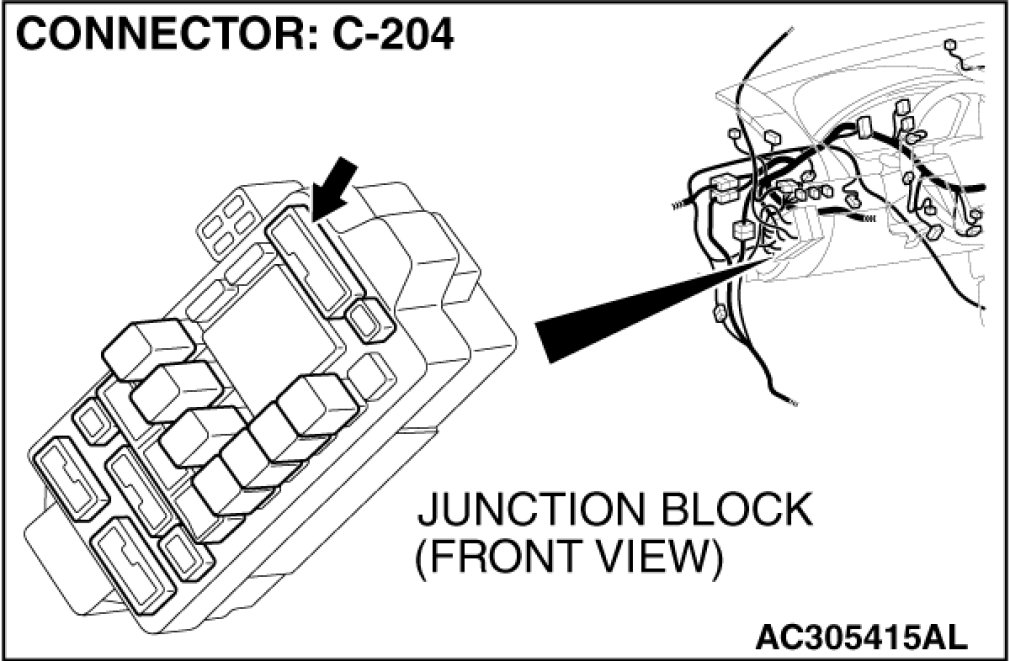 Also check junction block connector C-204 for loose, corroded, or damaged terminals, or terminals pushed back in the connector. If junction block connector C-204 is damaged, repair or replace the damaged component(s) as described in Harness Connector Inspection Harness Connector Inspection.