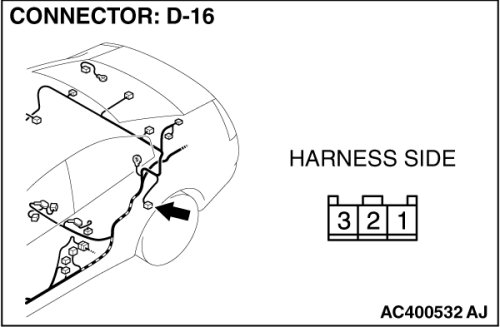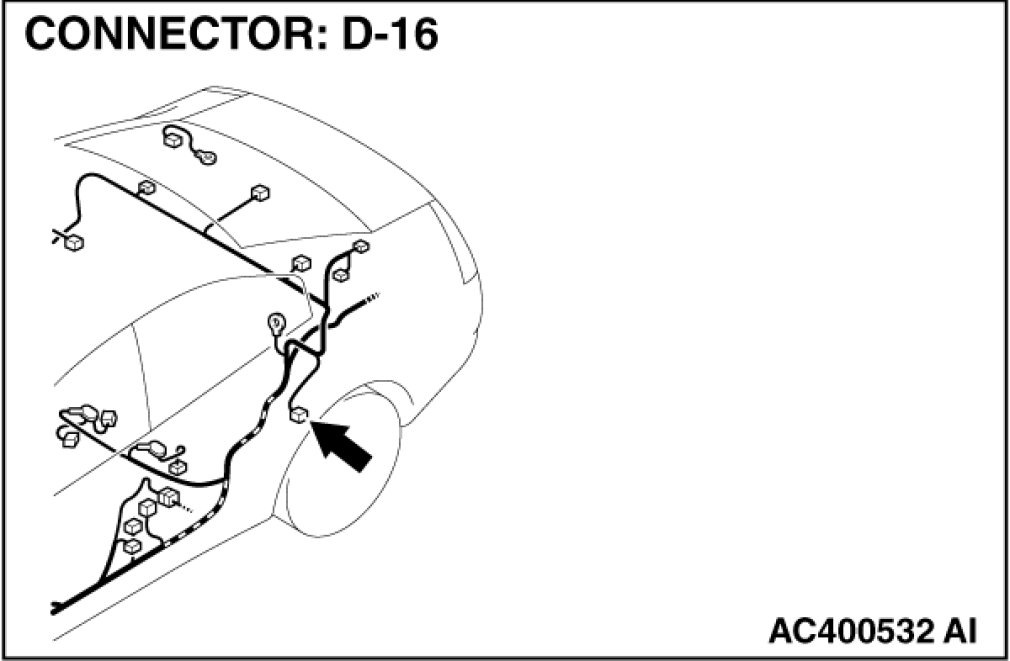 STEP 2. Check rear door switch (LH) connector D-16 for loose, corroded or damaged terminals, or terminals pushed back in the connector.