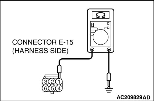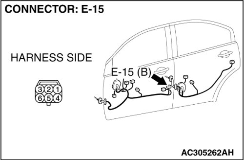 (1)Disconnect front door lock actuator (LH) connector E-15 and measure the resistance available at the wiring harness side of the connector.