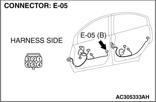 (1)Disconnect front door lock actuator (RH) connector E-05 and measure the resistance available at the wiring harness side of the connector.
