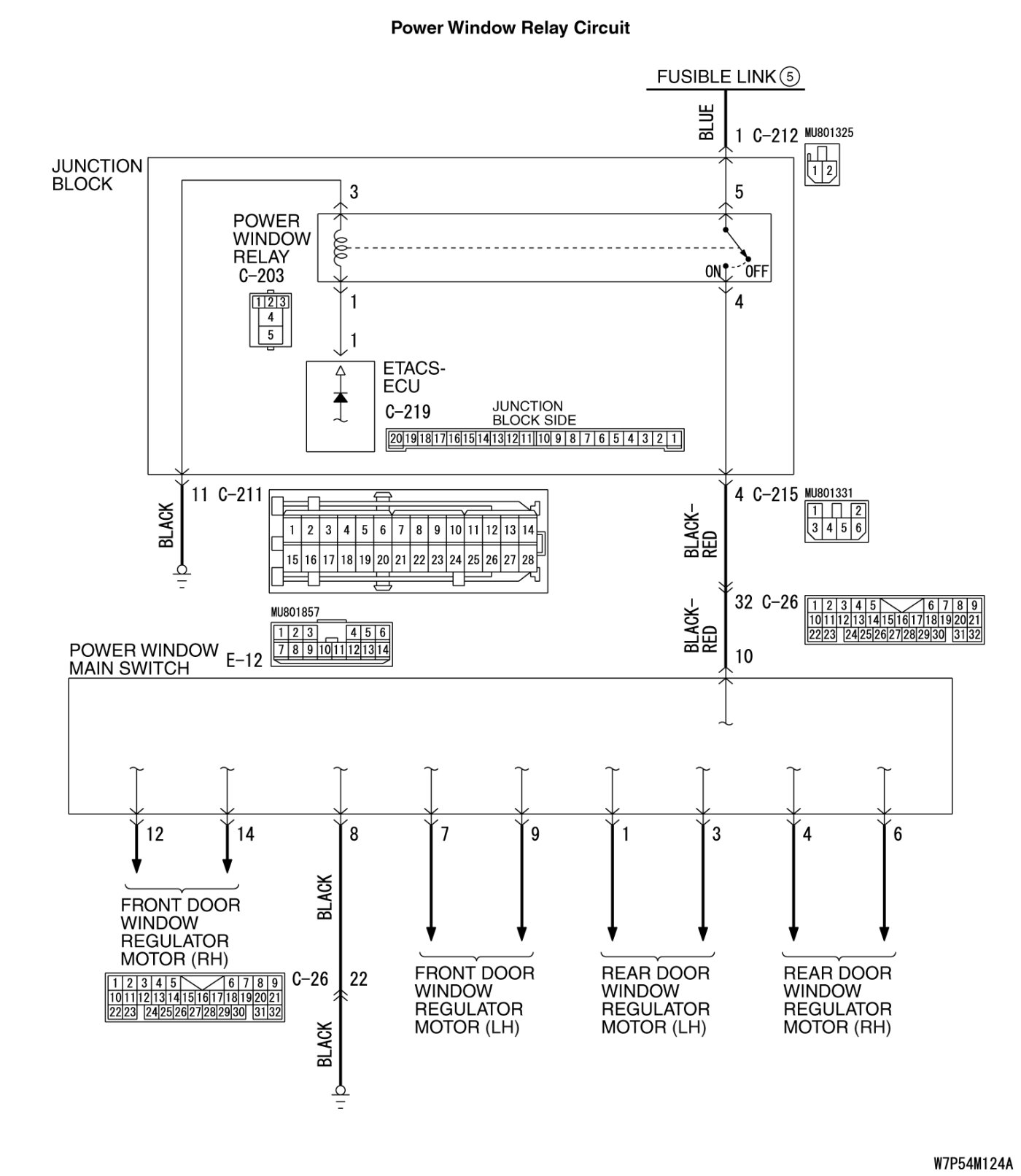 The ETACS-ECU turns on the power window relay (installed on the junction block) to activate the power windows when the ignition switch (IG1) is turned to the "ON" position.