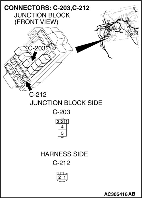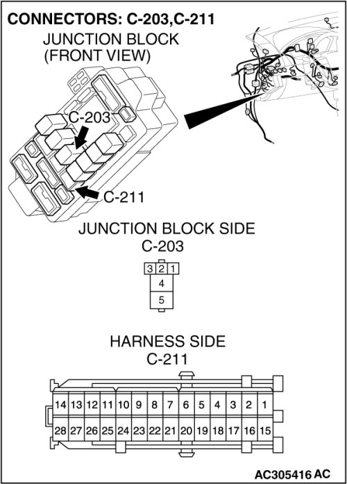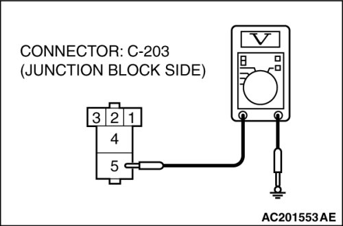 (1)Disconnect power window relay connector C-203 and measure the voltage available at the junction block side of the connector.