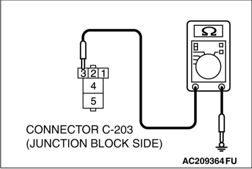 (1)Disconnect power window relay connector C-203 and measure the resistance available at the junction block side of the connector.