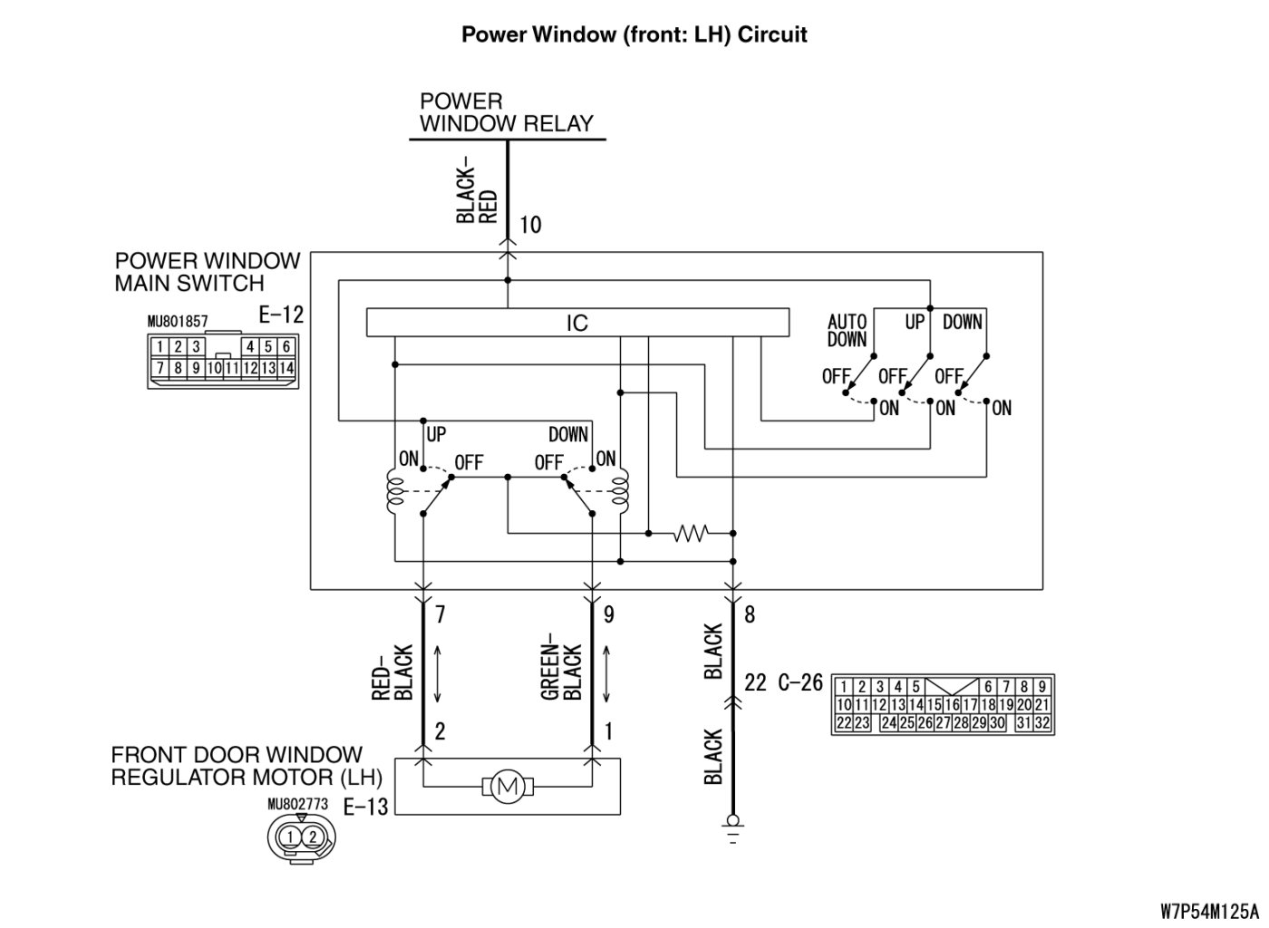 The power window main switch or the front power window regulator motor (LH) may be defective.