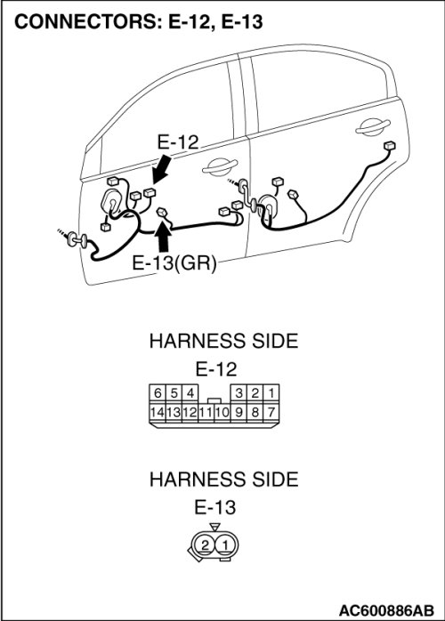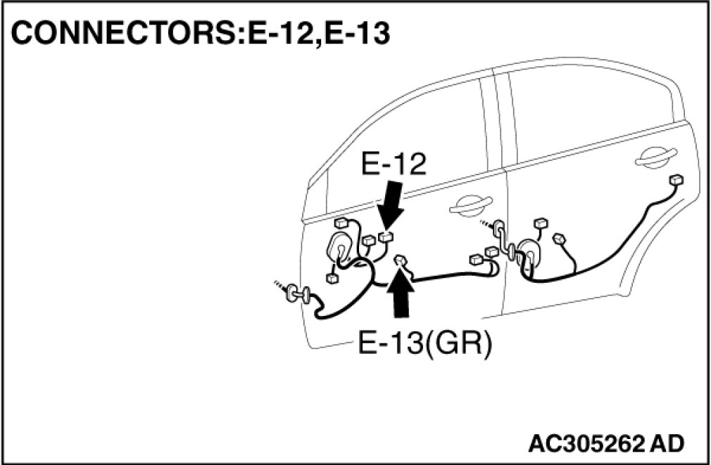 STEP 1. Check power window main switch connector E-12 and front power window regulator motor (LH) connector E-13 for loose, corroded or damaged terminals, or terminals pushed back in the connector.