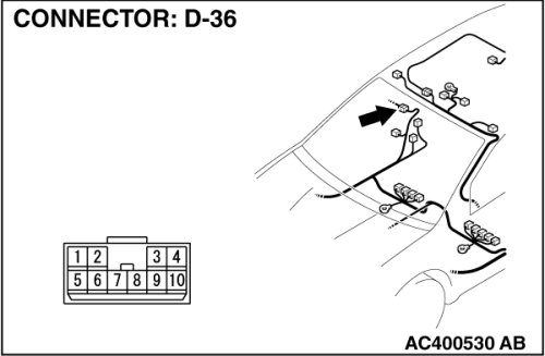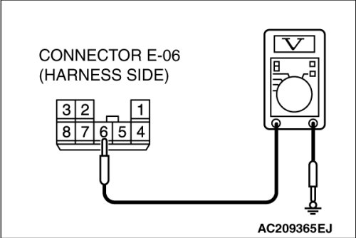 (1)Disconnect rear power window sub switch (RH) connector E-06 and measure the voltage available at the wiring harness side of the connector.