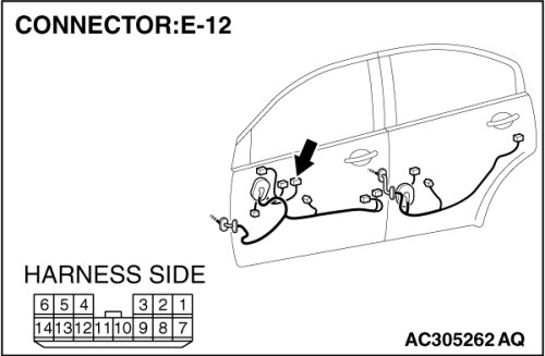 STEP 12. Check the wiring harness between power window main switch connector E-12 (terminals 12 and 14) and front power window sub switch connector E-04 (terminals 8 and 5).