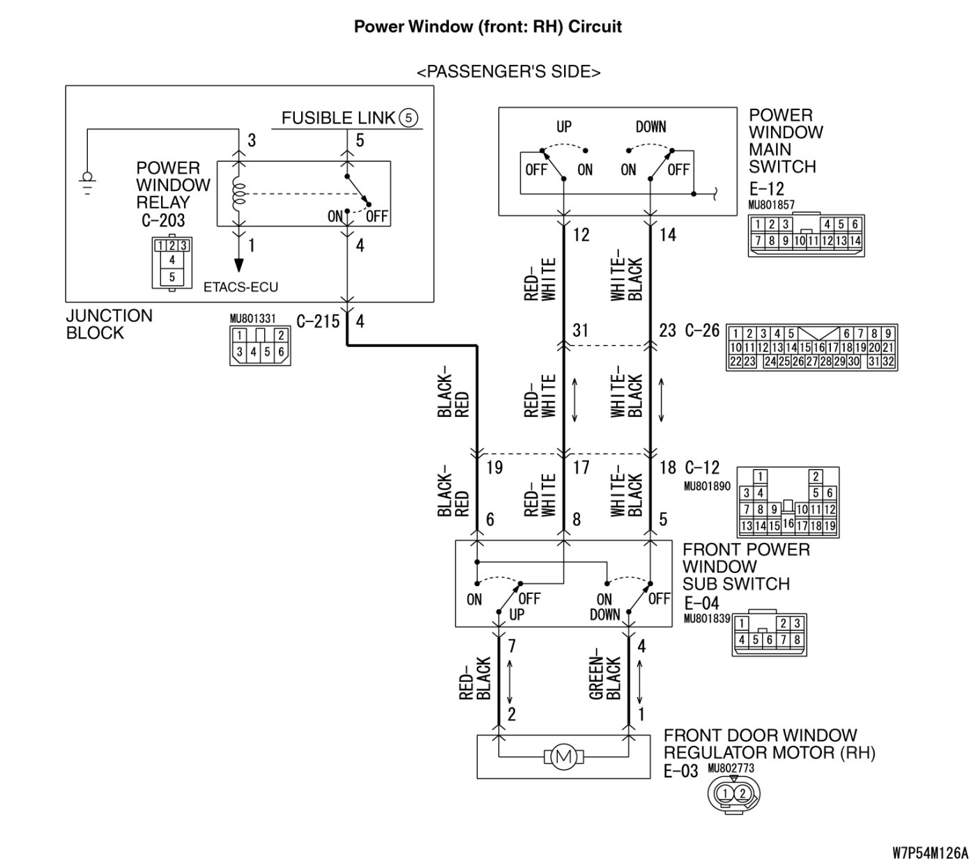 Q. Are front power window sub switch connector E-04 and front power window regulator motor (RH) connector E-03 in good condition?