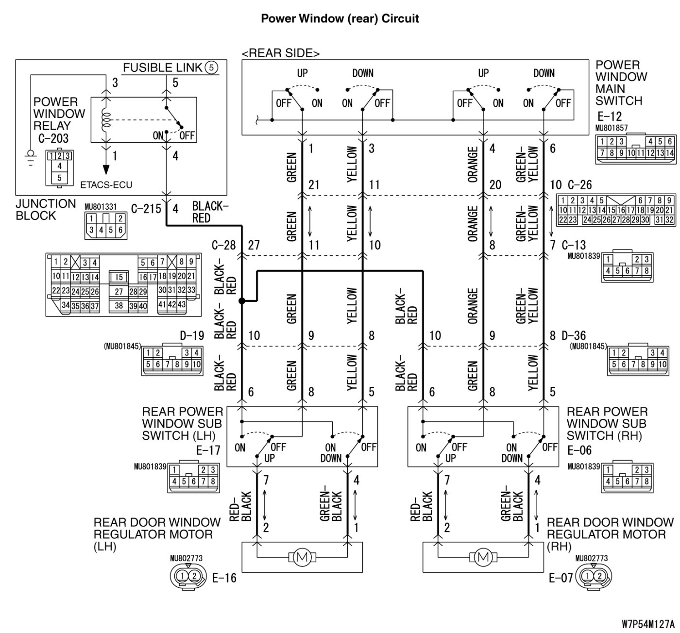 (LH) connector E-17 (terminals 4 and 7) and rear power window regulator motor (LH) connector E-16 (terminals 1 and 2).