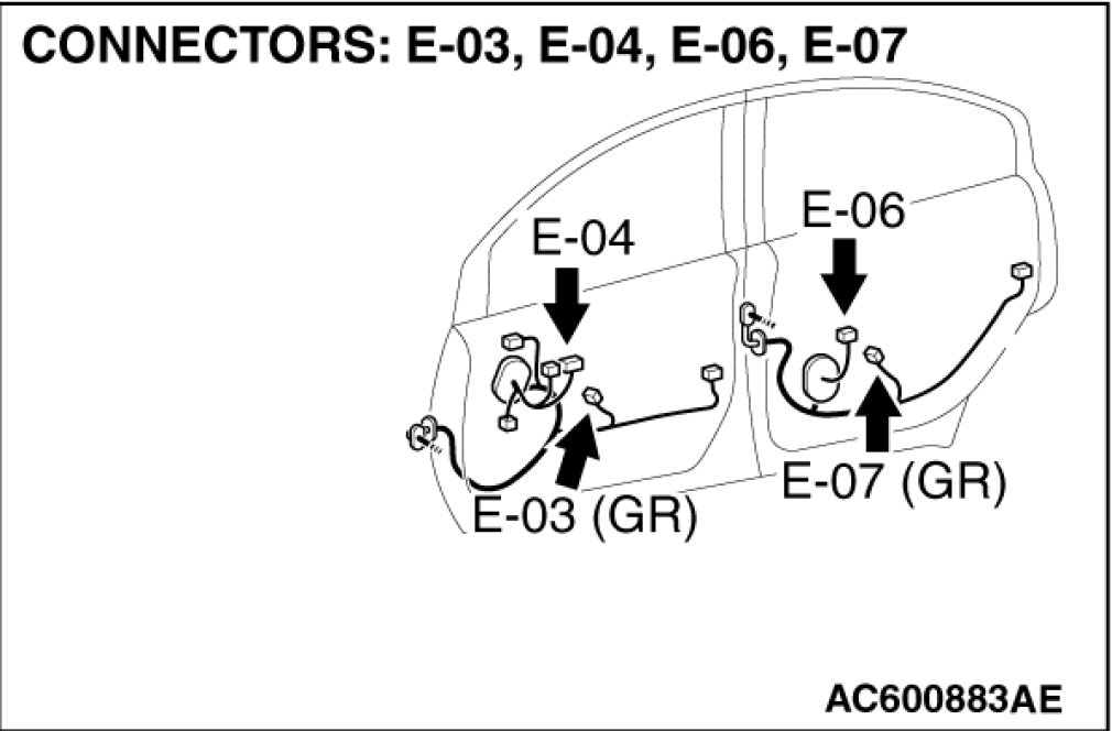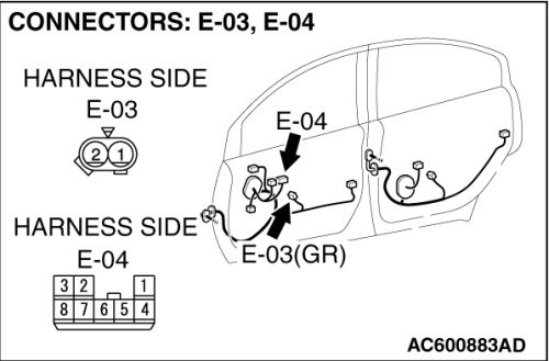 STEP 5. Check front power window sub switch connector E-04 and front power window regulator motor (RH) connector E-03 for loose, corroded or damaged terminals, or terminals pushed back in the connector.