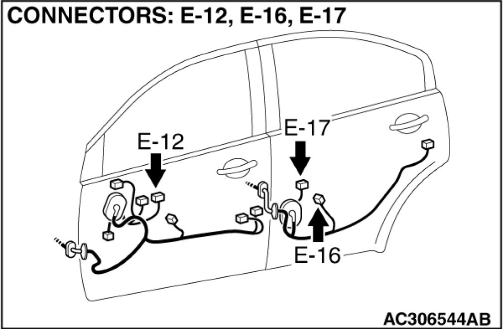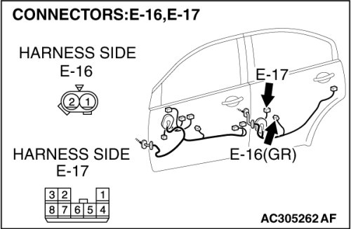 STEP 14. Check rear power window sub switch (LH) connector E-17 and rear power window regulator motor (LH) connector E-16 for loose, corroded or damaged terminals, or terminals pushed back in the connector.