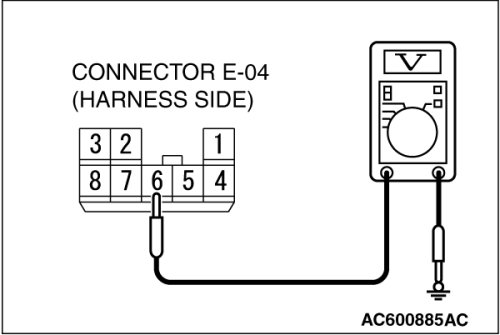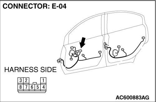 (1)Disconnect front power window sub switch connector E-04 and measure the voltage available at the wiring harness side of the connector.