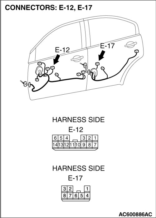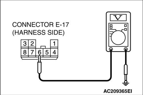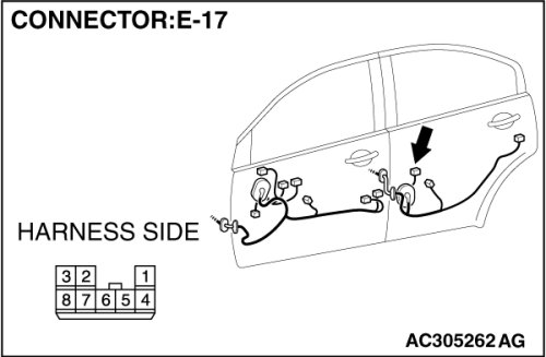 (1)Disconnect rear power window sub switch (LH) connector E-17 and measure the voltage available at the wiring harness side of the connector.