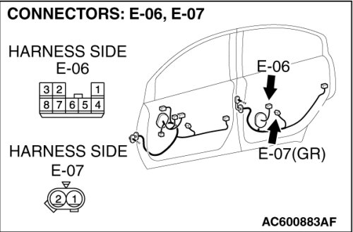 STEP 23. Check rear power window sub switch (RH) connector E-06 and rear power window regulator motor (RH) connector E-07 for loose, corroded or damaged terminals, or terminals pushed back in the connector.