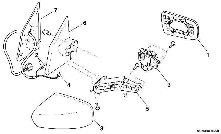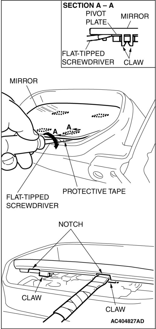 Slant the mirror upward with your hands. Then insert a flat-tipped screwdriver wrapped with protective tape between the pivot plate and mirror through the notch from behind the mirror. Now pry off the mirror claws and remove mirror as shown.