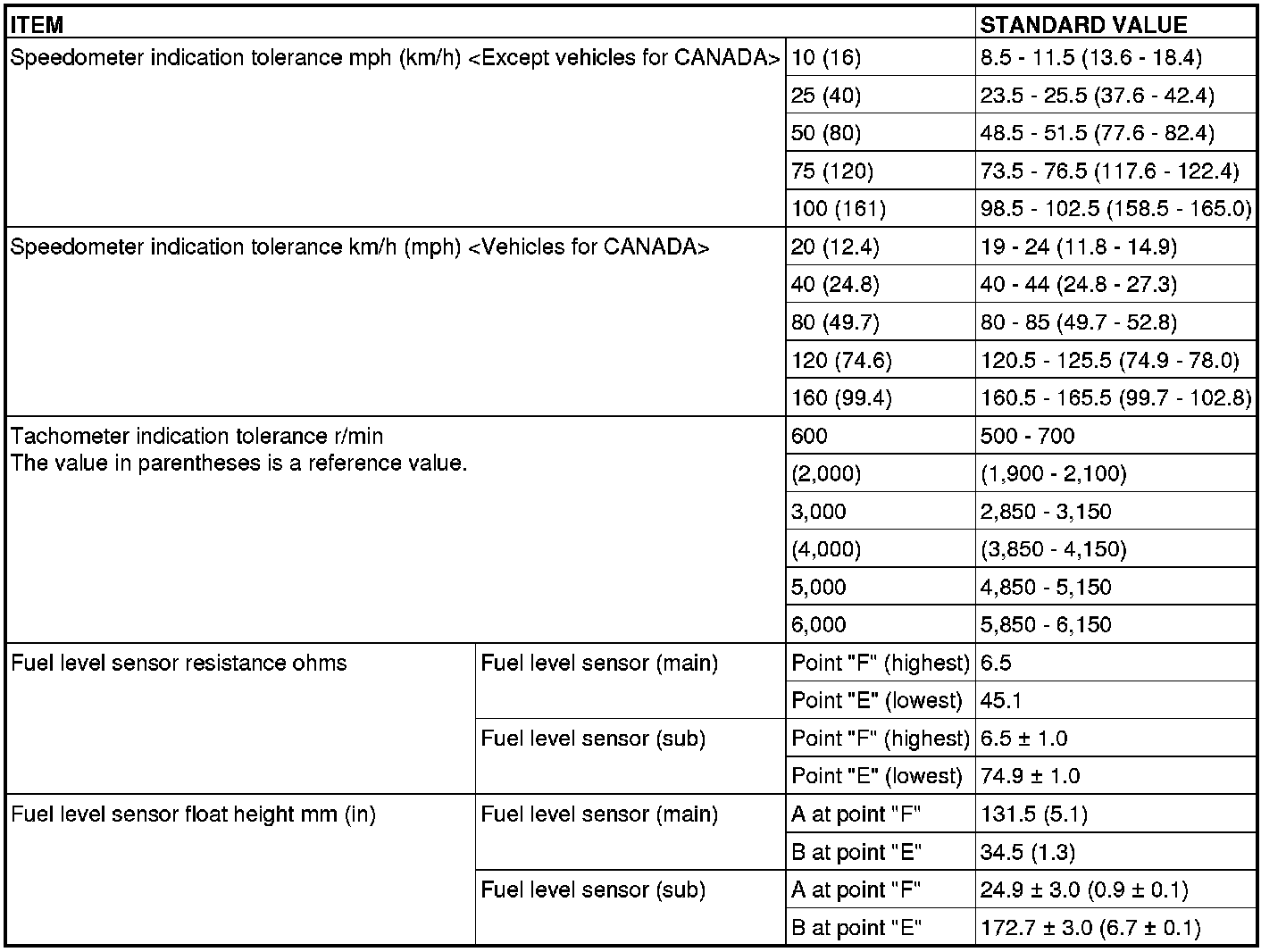 Instrument Panel, Gauges and Warning Indicators: Specifications