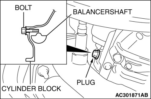 2. Adjust the timing mark of the engine oil pump sprocket. Unplug the cylinder block plug. Insert a bolt (M6, section width 10 mm, nominal length 45 mm) from the plug hole. If the bolt comes in contact with the balancer shaft, turn the engine oil sprocket one rotation. Re-adjust the timing mark and then check to see that the bolt fits. Do not remove the bolt until the valve timing belt is assembled.
