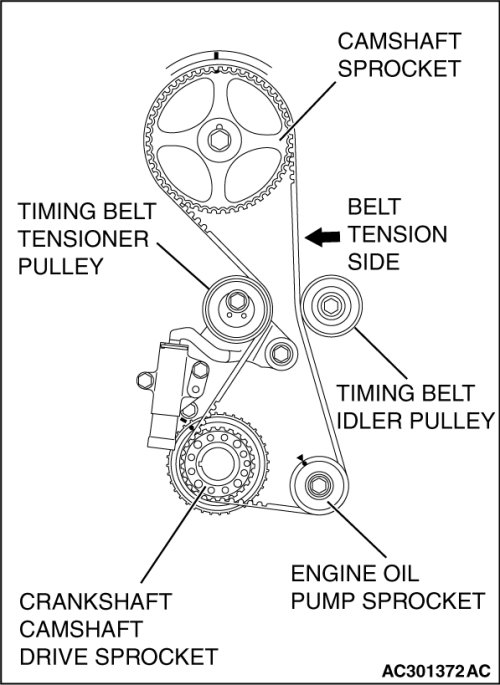 Incorporate the valve timing belt. Then apply reverse rotation (counterclockwise rotation) pressure to the cam shaft sprocket. Re-check to see that each timing mark is aligned while the tension side of the belt is right.