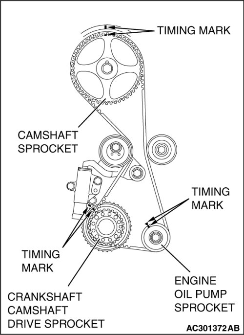1. Align the timing marks on the camshaft sprocket, crankshaft camshaft drive sprocket and engine oil pump sprocket.