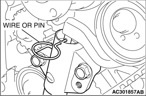10. Insert wire or pin removed in Step 7 again, and ensure that it can be pulled out with a light load. When wire or pin can be lightly removed, appropriate tension is applied on timing belt. In this case, remove wire or pin.