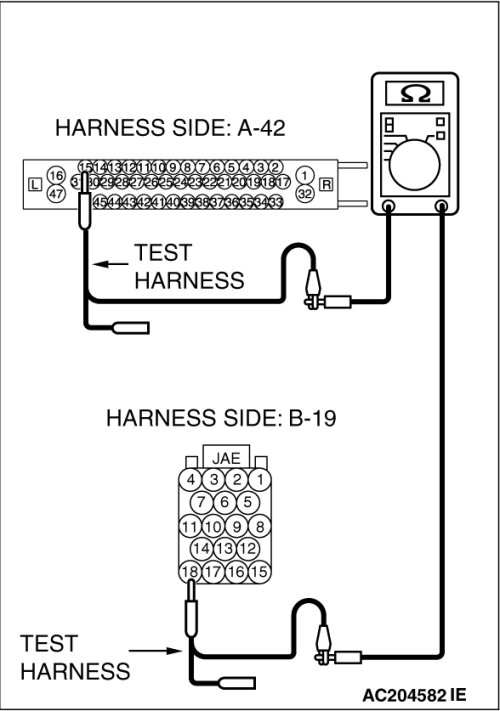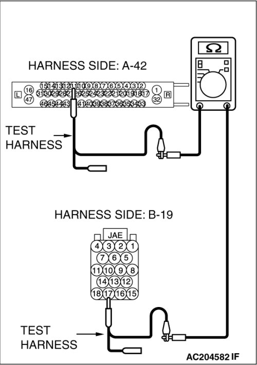 (1)Disconnect TCL/ASC-ECU connector A-42 and powertrain control module connector B-19, and measure the resistance between each wiring harness side connector.