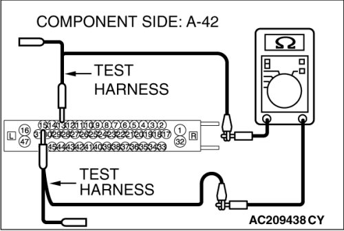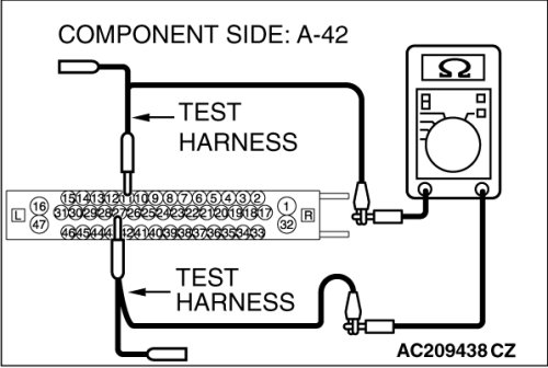 (1)Disconnect TCL/ASC-ECU connector A-42, and measure the resistance at the component side of TCL/ASC-ECU connector A-42.