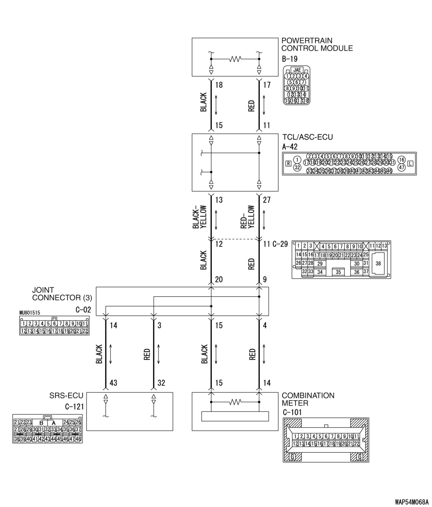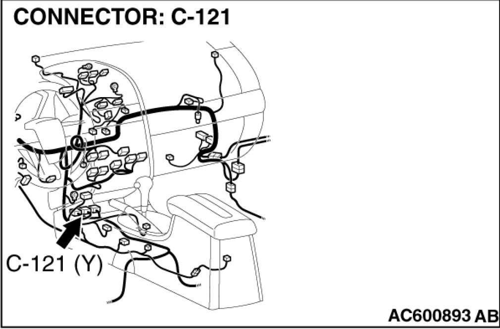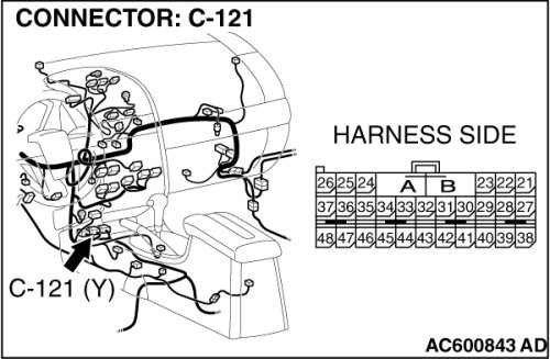 STEP 1. Check joint connector (3) C-02 and SRS-ECU connector C-121 for loose, corroded or damaged terminals, or terminals pushed back in the connector.