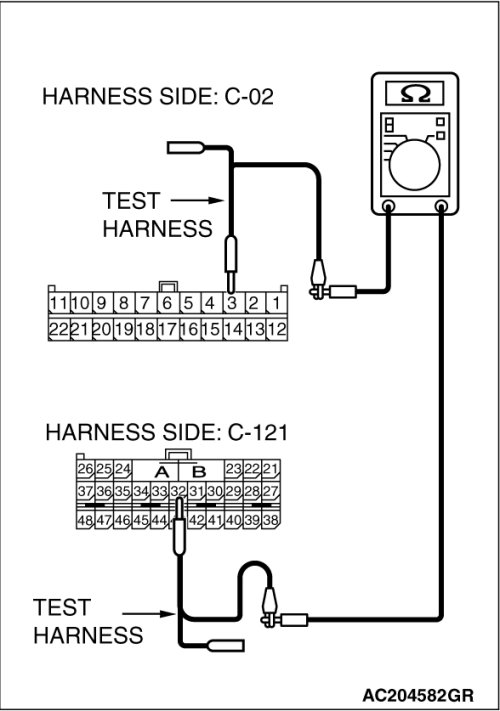 STEP 2. Check the CAN bus lines between joint connector (3) and the SRS-ECU. Measure the resistance between joint connector (3) C-02 and SRS-ECU connector C-121.