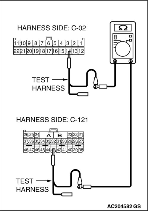 (1)Disconnect joint connector (3) C-02 and SRS-ECU connector C-121, and measure the resistances at the wiring harness sides of joint connector (3) C-02 and SRS-ECU connector C-121.