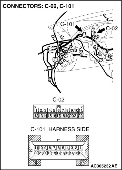 STEP 1. Check joint connector (3) C-02 and combination meter connector C-101 for loose, corroded or damaged terminals, or terminals pushed back in the connector.