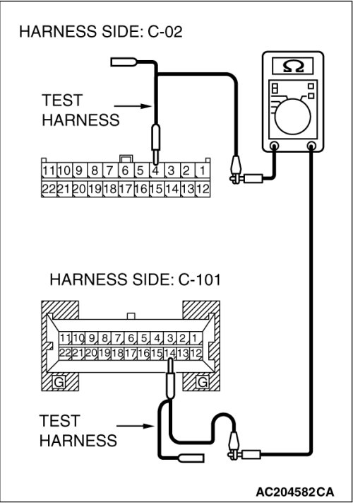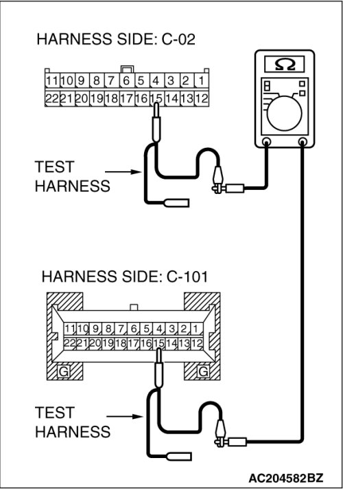 (1)Disconnect joint connector (3) C-02 and combination meter connector C-101, and measure the resistance between each wiring harness side connector.