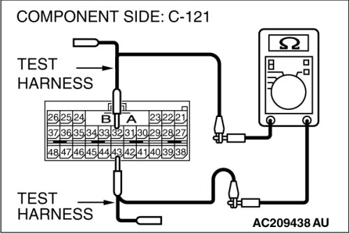 (1)Disconnect SRS-ECU connector C-121, and measure the resistance at the component side of SRS-ECU connector C-121.