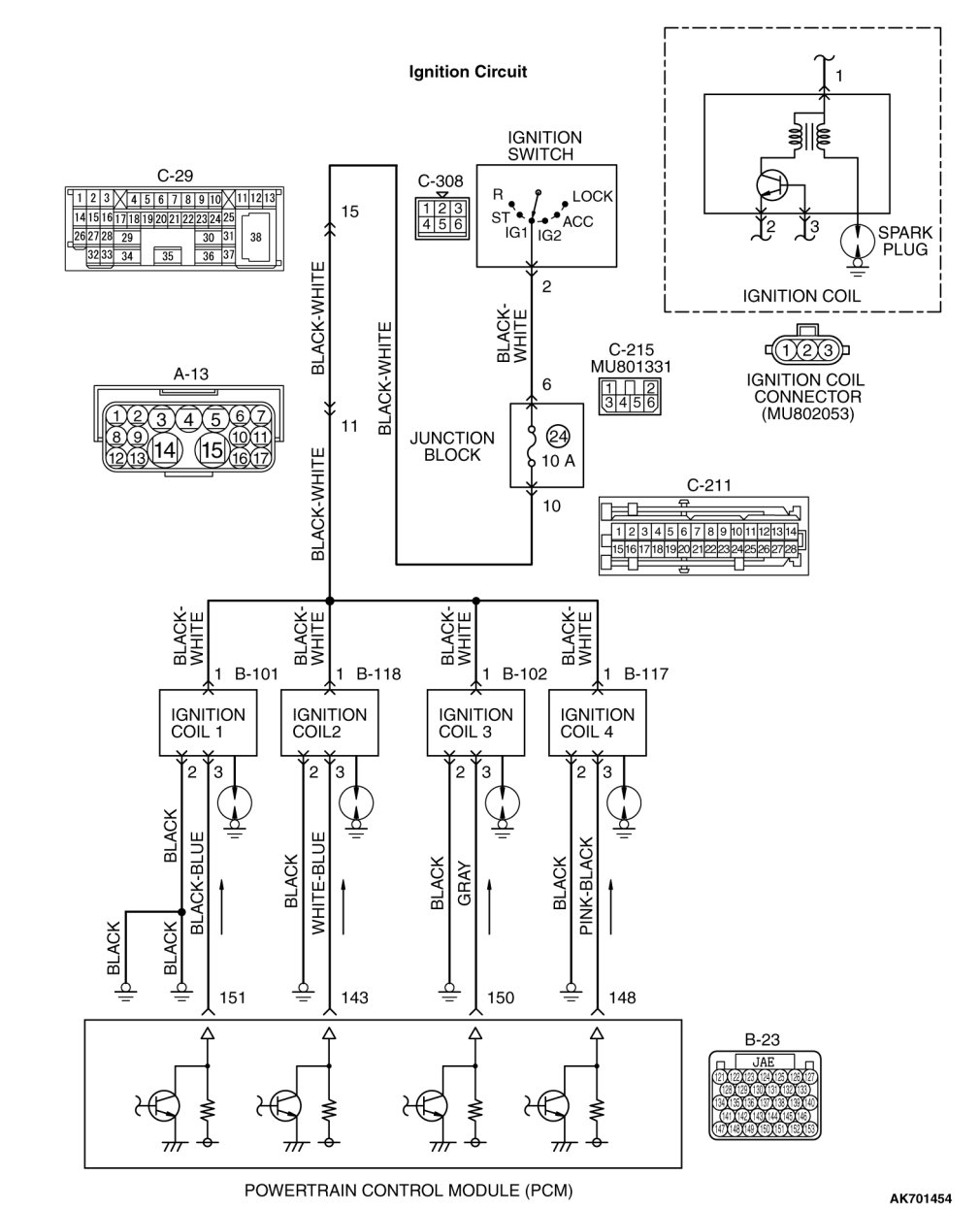 a. Check the harness wire between ignition coil connector B-101 (terminal No. 3) and PCM connector B-23 (terminal No. 151) at ignition coil 1.