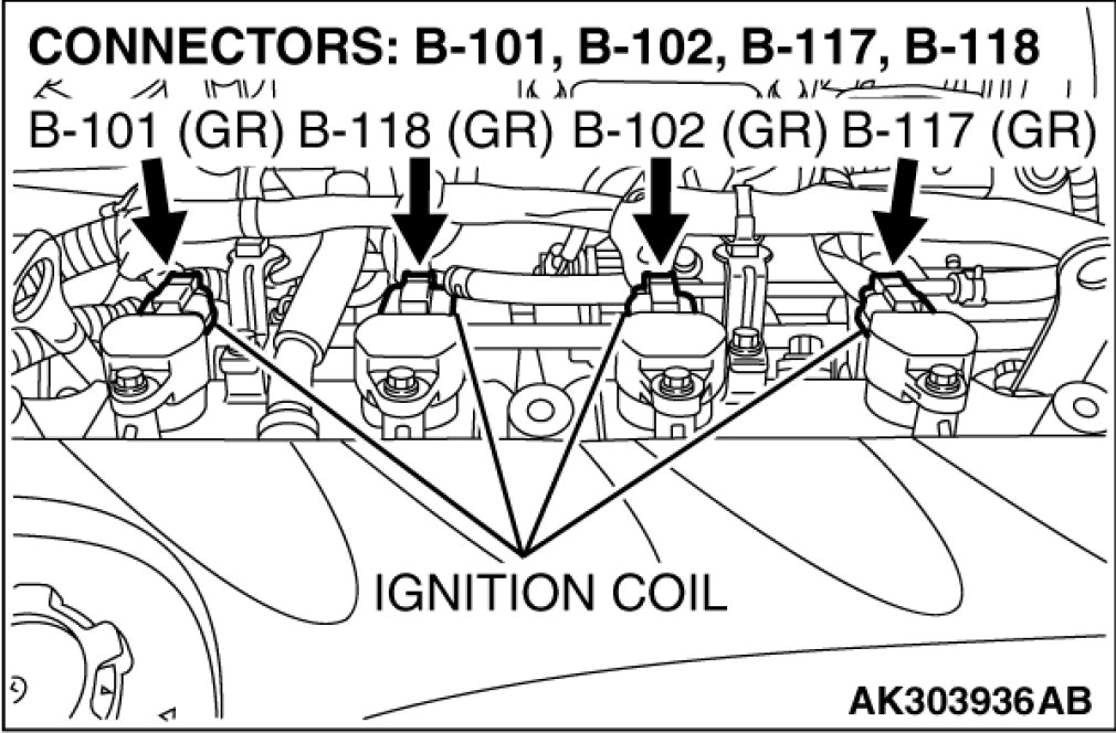 STEP 4. Check the circuit at ignition coil harness side connector B-101, B-102, B-117 and B-118.