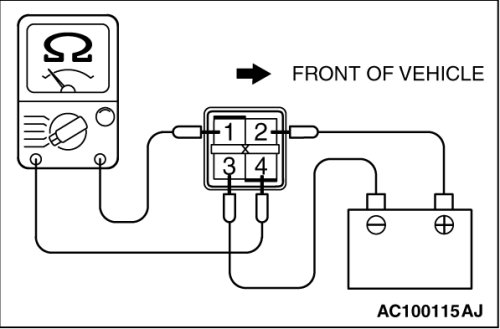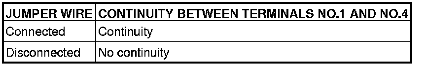 3. Check for continuity between A/T control relay terminals 1 and 4 when the jumper wires are connected to and disconnected from the battery.