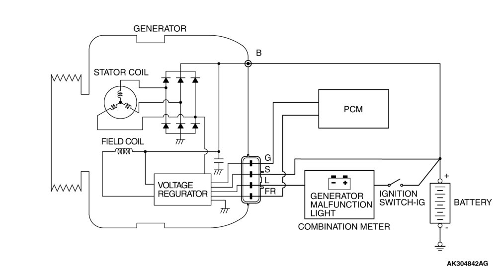 The generator output voltage rises as the field current increases and it falls as the field current decreases. When the battery positive voltage (generator S terminal voltage) reaches a regulated voltage of approximately 14.4 V, the field current is cut off. When the battery positive voltage drops below the regulated voltage, the voltage regulator regulates the output voltage to a constant level by controlling the field current.