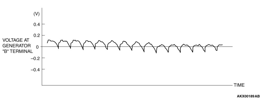 The voltage waveform of the generator "B" terminal can undulate as shown at left. This waveform is produced when the regulator operates according to fluctuations in the generator load (current), and is normal for the generator.