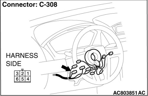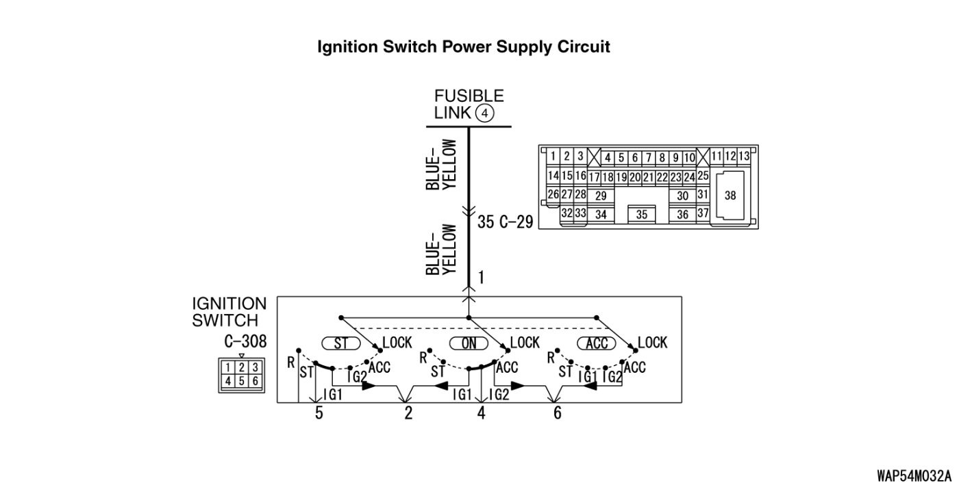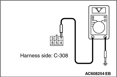 STEP 3. Check the Wiring harness between ignition switch connector C-308 (terminal No.1) and fusible link (4).