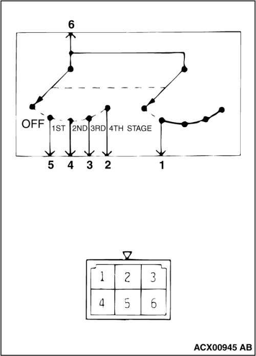 This figure illustrates a complex switch. The continuity between terminals at each position is as indicated in the table below.