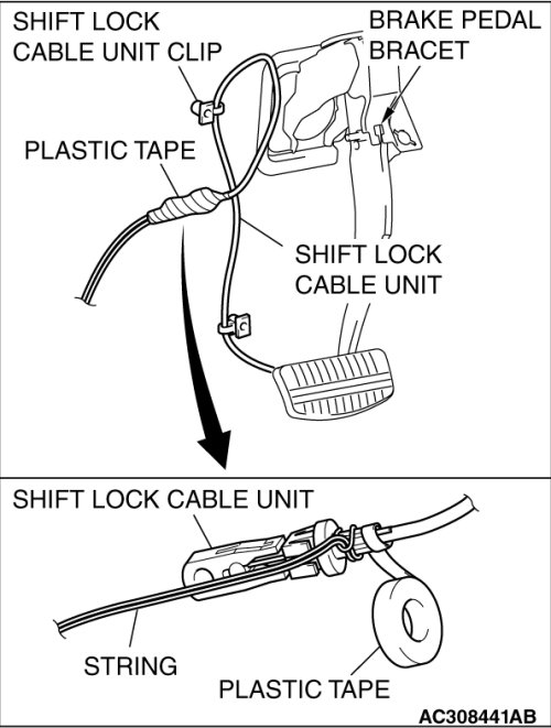 4. Remove the string and the plastic tape from the shift lock cable unit, and then install the shift lock cable unit to the brake pedal bracket.