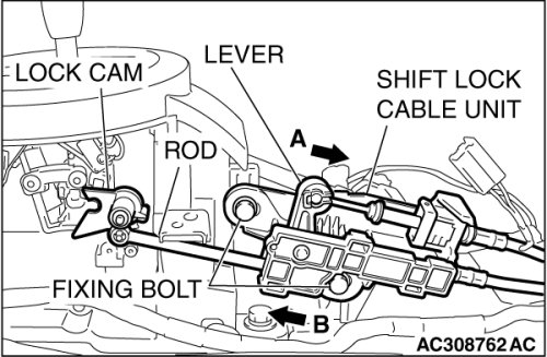 3. Install the rod of the shift lock cable unit to the lock cam, push the lever in direction A, push the shift lock cable unit in direction B and tighten the fixing bolt at the standard torque.