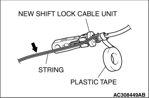 Bind up the cap of new shift lock cable unit with the string threaded behind the heater unit when removing and wind a plastic tape around it.