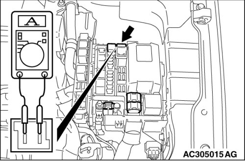 1. Remove the power window fuse and connect an ammeter as shown in the illustration.