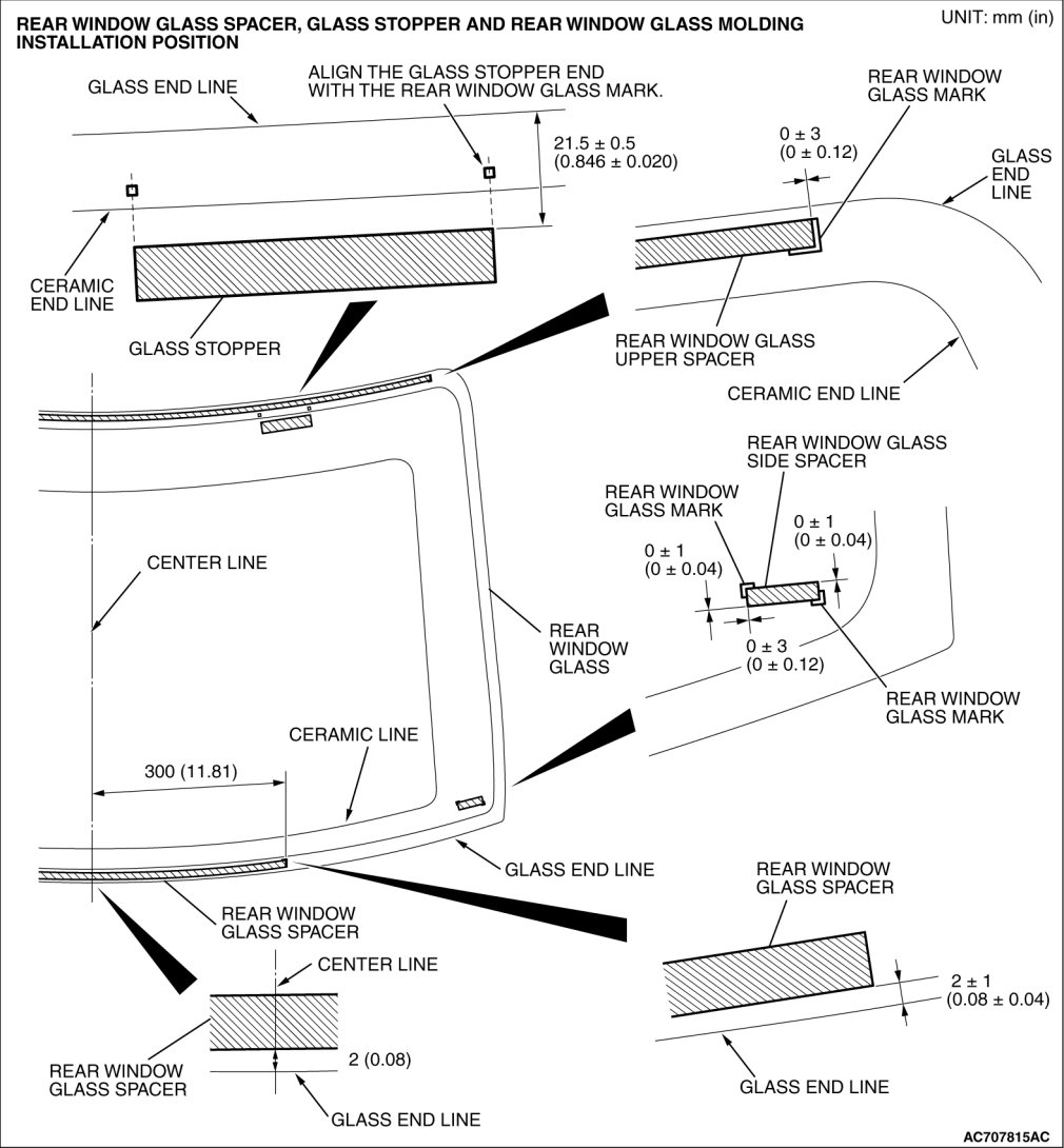 Install the rear window spacer and glass stopper to the specified positions so that there are no adrift or bent surfaces inside the rear window glass.