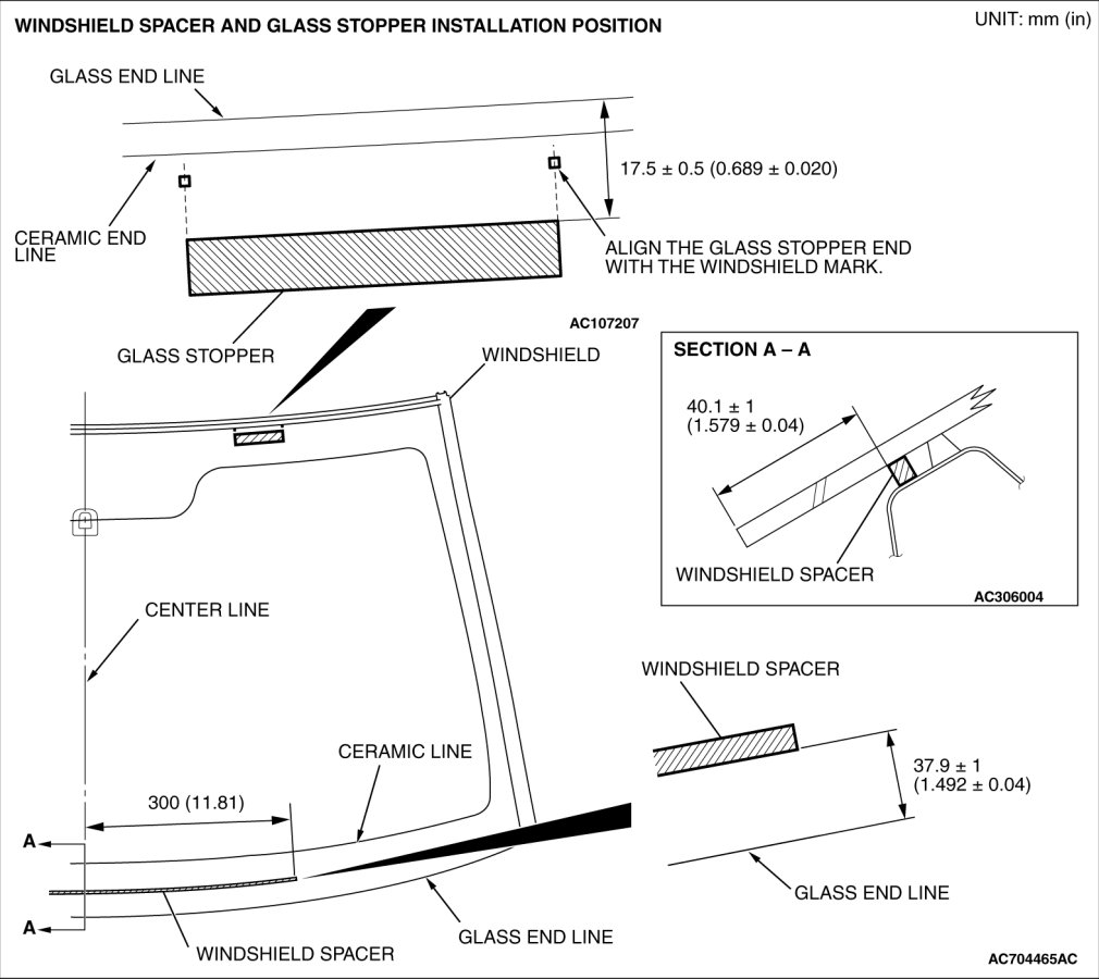 Install the windshield spacer and glass stoppers to the specified positions so that there are no adrift or warped surfaces inside the windshield.