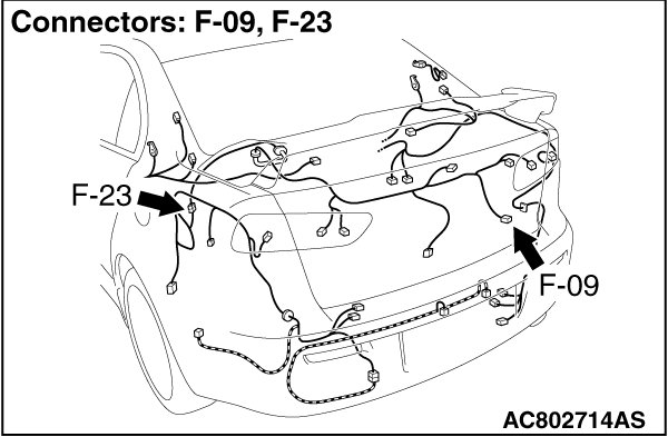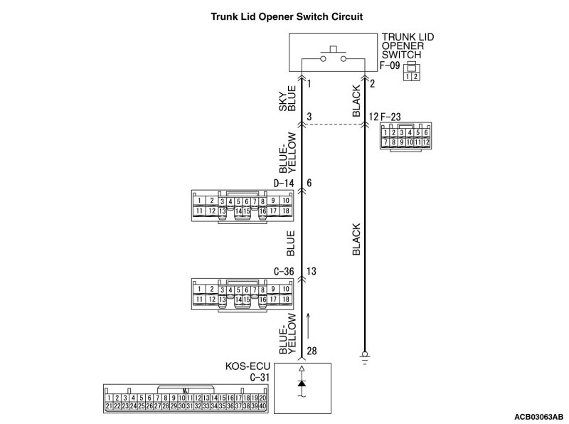 STEP 4. Check the wiring harness between KOS-ECU connector C-31 (terminal No. 28) and trunk lid open switch connector F-09 (terminal No. 1), and between trunk lid open switch connector F-09 (terminal No. 2) and ground.